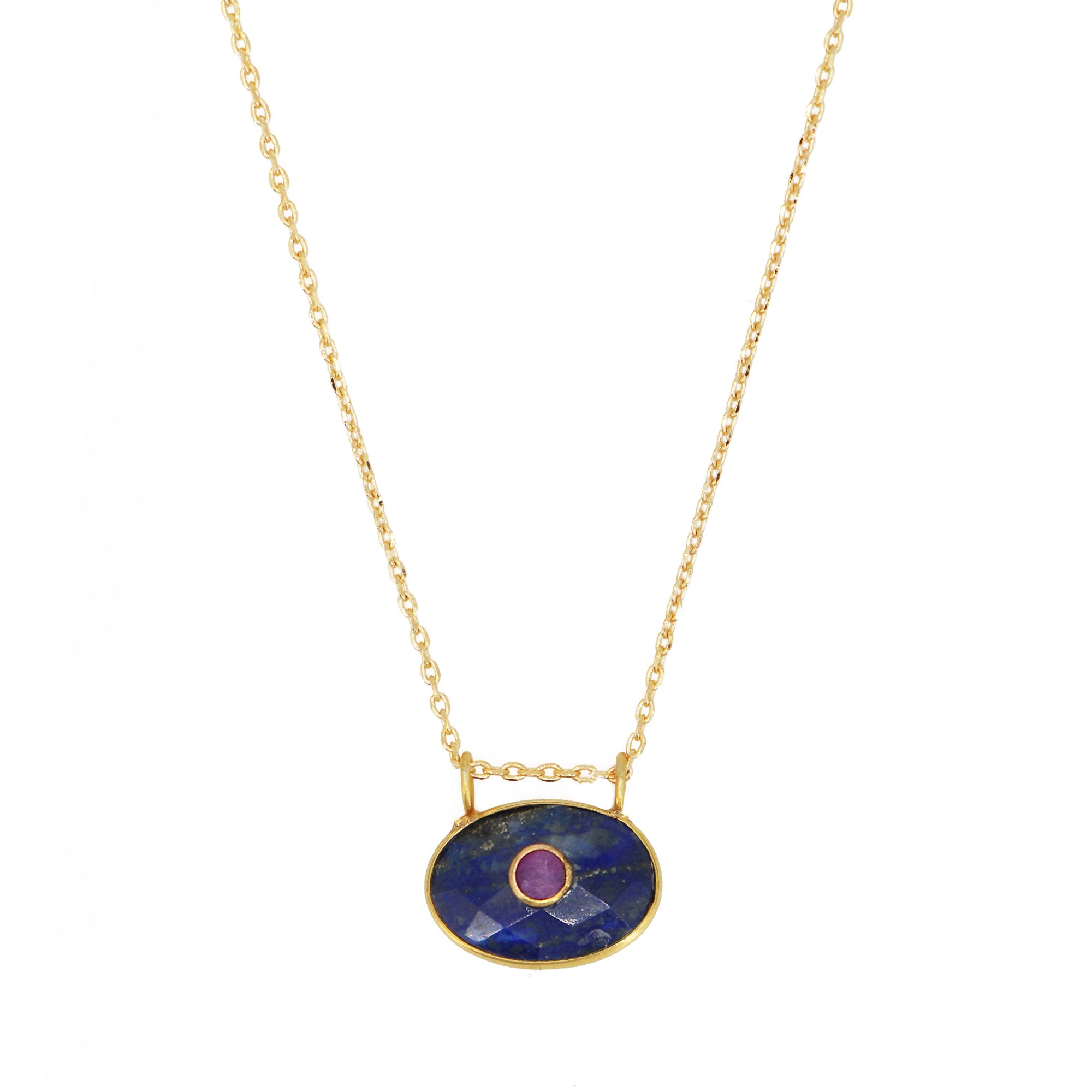 Découvrez le ravissant collier New Deva Lapis, une pièce emblématique de la Ligne Deva. Ce collier se distingue par sa chaîne simple et son pendentif en pierre naturelle en forme d'œil porte-bonheur, apportant une touche d'élégance et de mystère à votre tenue.